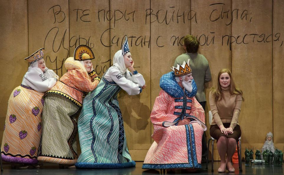 Los Dioses saben que tengo poca estima a Dmitri Tcherniakov como director de escena. Hasta la fecha no me ha satisfecho ninguna de sus puestas en escena, incluso alguna me ha parecido un dislate. Sin embargo, en esta ocasión tengo que subrayar, que este montaje –en cuya coproducción participa el Teatro Real de Madrid- derrocha creatividad e imaginación, bordeando la genialidad en algunos momentos y con un acertadísimo, espléndido, uso de estupendas proyecciones -a cargo de Gleb Filshtinsky-. Antes del comienzo de la música, Svetlana Aksenova (intérprete de la Zarina Militrisa) ataviada con ropa actual al igual que su hijo el Zarevich, -que juega con soldados, una ardilla y una muñeca con forma de cisne-se dirige al público (en ruso con traducción al inglés, francés y neerlandés las partes habladas, luego las cantadas sólo con sobretítulos en los dos idiomas oficiales de Bélgica) y expresa que vive sola con su hijo que es autista y no habla con nadie, excepto su madre. No conoce a su padre, que ha sido el único amor de su vida. Todo ello en la parte delantera del escenario que queda limitado por un gran muro que parece la defensa de un castillo o fortaleza. Para hacerle comprender a su hijo cómo se ha llegado a esta situación, recurre a un cuento («sólo los cuentos de hadas son reales para él»), el del Zar Saltán. Comienza la música y vemos a los personajes con traje de época fantástica, propia del cuento, de hecho están basados en la ilustración que del obra de Pushkin realizó Ivan Bilibin en 1905. Vemos cómo el Zar Saltán elige como esposa a la hermana pequeña, la más modesta frente sus infatuadas hermanas. Estamos, por tanto, ante una especie de Cenicienta, que en este caso, cuenta con la inquina de sus hermanas mayores aliadas con la anciana pariente Barbarikha. Zar y Zarina viven 20 días de felicidad hasta que el primero ha de partir a la guerra. Las malas artes del trío consiguen, por un lado hacer creer al Zar que el hijo que ha engendrado es un monstruo y por otro, mediante una orden falsificada del propio Rey, que introduzcan a Zarina y Zarevich en un tonel y lanzarlos al mar.