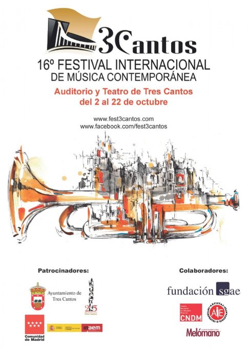 El Festival Internacional de Música Contemporánea de Tres Cantos (Fest3Cantos), punto de encuentro de compositores contemporáneos, solistas y ensembles de reconocido prestigio, celebra este año su decimosexta edición del 2 al 22 de octubre, en el Auditorio y Teatro del Centro Cultural “Adolfo Suárez”. Con nuevo equipo directivo al frente, bajo la dirección de Alfonso Carraté y con el compositor David del Puerto como asesor artístico, el reconocido festival del municipio madrileño ofrecerá un amplio programa, que incluye masterclasses, siete conciertos, cinco estrenos absolutos, tres encargos del propio festival, y la participación de cuatro comunidades autónomas: Comunidad de Madrid, Comunidad Valenciana, Andalucía y País Vasco. Como novedad, dentro de la programación de este año, coincidiendo con la celebración del 400 aniversario de la muerte de William Shakespeare y Cervantes, el festival rendirá homenaje a Don Quijote y Shakespeare. La presentación e la actual edición tendrá lugar el 21 de septiembre en la Sala Manuel de Falla del edificio de la SGAE de Madrid, y contará con la presencia de Alfonso Carraté, David del Puerto, Jesús Moreno (alcalde del Ayuntamiento de Tres Cantos) y la intervención del violinista Manuel Guillén.