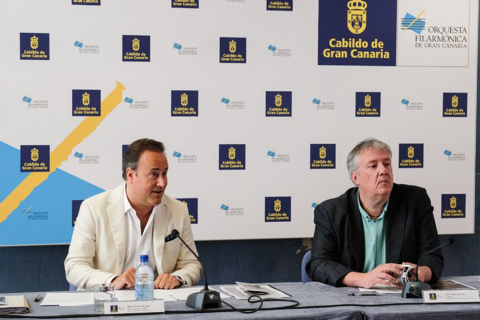 El consejero de Cultura del Cabildo de Gran Canaria y presidente de la Fundación OFGC, Carlos Ruiz, acompañado por el director artístico y titular de la OFGC, Karel Mark Chichon, presentaron en la mañana de ayer la nueva temporada de abono 2018-2019 de la Orquesta Filarmónica de Gran Canaria.