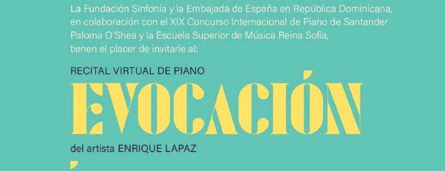 La Embajada de España en República Dominicana inaugurará la VIII edición de «Semanas de España» con un recital de piano de la mano de la Fundación Sinfonía y de la Escuela Superior de Música Reina Sofía, a cargo de Enrique Lapaz. La cita será retransmitida el próximo lunes 12 de octubre, Día de la Hispanidad, a las 20:00 horas, a través de las redes sociales de la Embajada de España, Fundación Sinfonía y del Centro Cultural de España. La cita, que se presenta bajo el rótulo de «Evocación», tendrá lugar en el Auditorio Sony de la Escuela Superior de Música Reina Sofía, del qe ha sido alumno Lapaz.