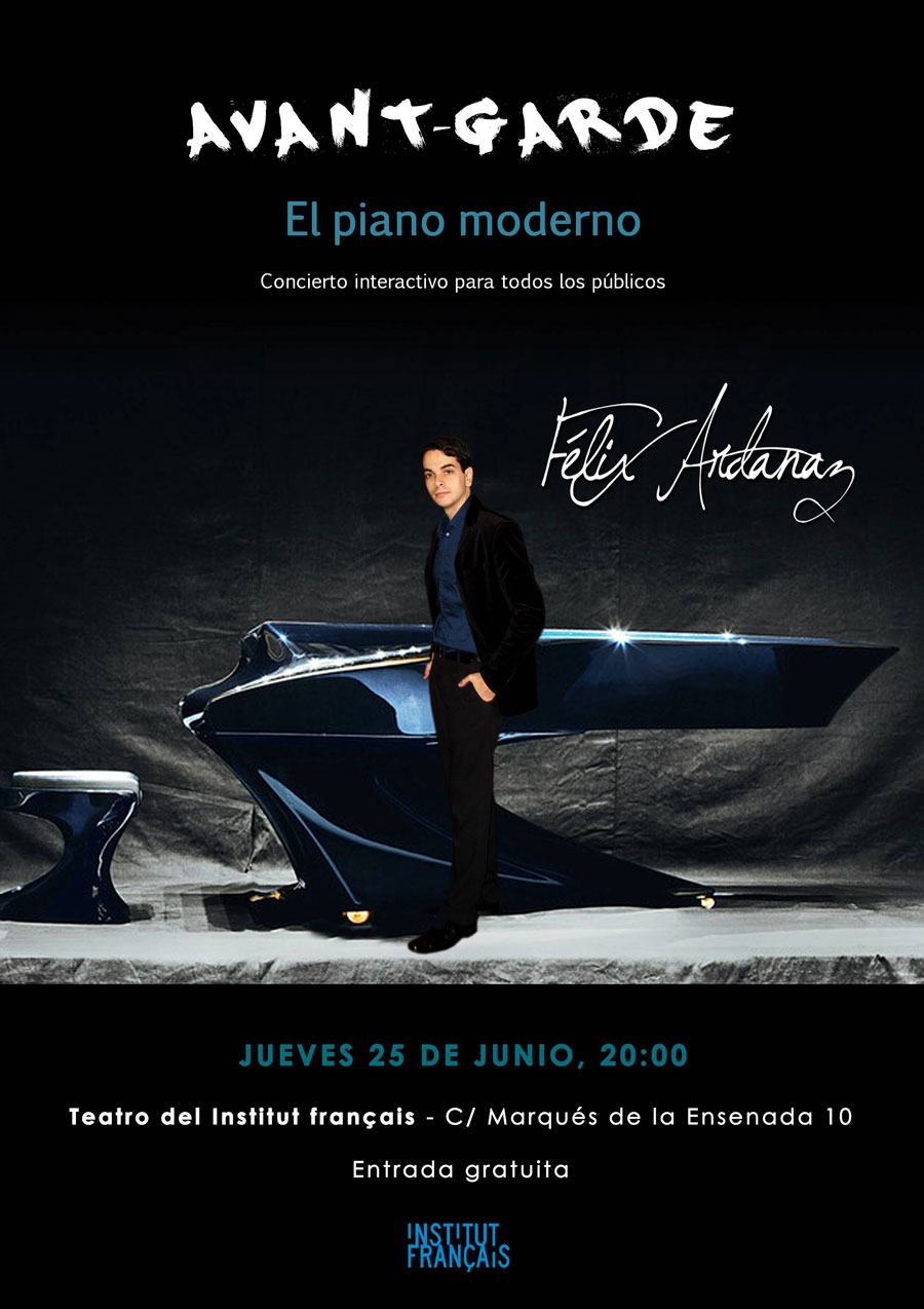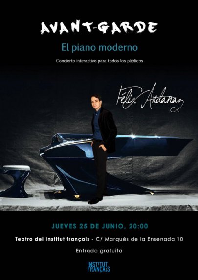 Félix Ardanaz ha ofrecido hoy a las 20 horas, en el Teatro del Instituto Francés de Madrid, un recital de piano moderno e interactivo, que el pianista español presenta con el sugerente título de "Avant Garde". Se trata de un espectáculo musical dirigido a todas las edades y a todo tipo de público: niños, adultos, músicos, melómanos y personas interesadas en conocer los misterios de la literatura contemporánea.
