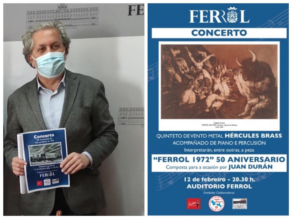 Ferrol, 12-I-2022, Auditorio de Ferrol, Concierto Aniversario del 50º Aniversario del Diez de Marzo de 1972. Hércules Brass, Gabriel López Rodríguez, piano. Miguel Castro Pérez, Jorge Juan Deaño Núñez y Mª Isabel Diego Calviño, percusión. Programa: A. Di Lorenzo, Go!; A. Vivaldi-J.S. Bach, L’estro armònico, op.3 nº 11, arreglo de D. Baldwin. M. Arnold, Quinteto para metales, op. 73: G. Puccini, Vals de Musetta de La bohème. P.Nagle, Mills for five; Juan Durán, Ferrol 1972 para quinteto de viento-metal, un piano y tres percusionistas, encargo de la Asociación Cívica Fuco Buxán; estreno absoluto