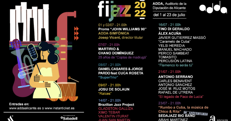 El Festival Fijazz 2022 del Auditorio de la Diputación de Alicante ha presentado su actual edición, protagonizada por importantes artistas españoles e hispanoamericanos. El festival dará comienzo el 1 y 2 de julio con la orquesta Adda Sinfónica bajo la dirección de Josep Vicent, director titular del conjunto y artístico del ciclo. La cita se centrará en la música de John Williams. Uno de los puntos fuertes del festival es la presencia del más importante pianista español del presente, el valenciano Josu De Solaun, que ofrecerá un recital bajo el tótulo «Raíces» con música compuesta en acto. Brazilian Jazz Project [Gladston Galliza, Ximo Tebar, Valentin Iturat, Juan San Martin]; Tino di Geraldo y Álex Acuña; Antonio Serrano y la Sedajazz Big Band con un concierto titulado «Rumbo a Cuba, la música de Chico & Rita» cierran el festival, que tendrá lugar durante el mes de julio.