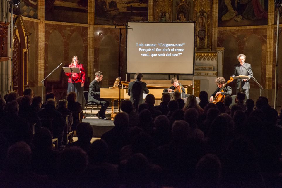 Así pues, el programa del viernes estaba marcado por dicho aniversario. La inclusión de Couperin junto a la obra de Soler es interesante y no nos parece gratuita: el influjo del primero sobre el segundo se hace notar en varios aspectos de su obra, como es el caso de la audacia contrapuntística en L’Art de toucher le Clavecin, y concretamente en las Leçons de ténèbres, en la utilización de disonancias con un profundo sentido dramático o en la preponderancia estructural del texto, como sucede en el recitativo lírico con el texto latino (fiel a las Lamentaciones de Jeremías) que sigue a los melismas, extendidos sobre cada una de las letras del alfabeto hebreo que numeran los versículos. La filiación estética de las Leçons con la Passio de Soler se manifiesta también en otros detalles como el uso dramático del silencio. Pudimos escuchar una buena versión de la obra de Couperin, en la que la soprano Marta Matheu desplegó una brillante paleta de recursos expresivos en las dos primeras lecciones a una voz. Marta Infante se incorporó en la tercera y última con sabia administración de los recursos, mostrando junto a Matheu un excelente manejo de las dinámicas especialmente en los largos melismas y transmitiendo con inteligencia la exuberante retórica couperiniana. La solidez y discreción armónica y melódica del continuo que ofrecieron Oleguer Aymamí y Dani Espasa resolvió los desafíos acústicos de la iglesia, hasta donde técnicamente se podían resolver. Como se hizo con la Passio tras el descanso, durante las Leçons se proyectaba el texto en catalán sobre una pantalla colocada en el altar. Dada su importancia y el carácter dramático de ambas obras, la decisión fue acertada.