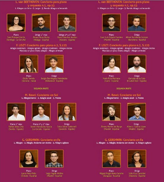 El XV Curso para Pianistas, Directores y Joven Orquesta Leonesa, que desde el pasado 2 de septiembre tiene lugar en León bajo el auspicio de la Fundación Eutherpe y que durante siete días ha acercado a la ciudad española a algunos de los más talentosos jóvenes músicos de nuestro país, concluye este fin de semana con dos conciertos en el Auditorio de León, donde los alumnos se convertirán protagonitas. Los días 8 y 9 a las 20:30 horas los parcicipantes del curso tocarán y dirigirán el Concierto para piano y orquesta nº 1 en do mayor Op. 15 de Beethoven, el Número 2 de Liszt, el Concierto en sol de Ravel y el Concierto en fa de Gershwin. La Fundación Eutherpe está dirigida por Margarita Morais. La entidad posee una importante vertiente pedagógica y un ciclo anual de conciertos en León y Valencia que la convierten en una de las más importantes entidades europeas de su campo.
