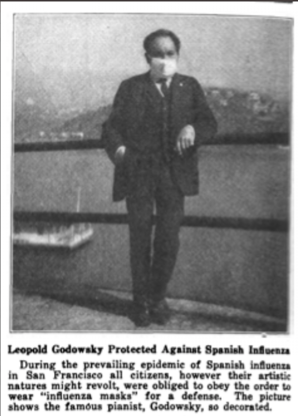 La imagen la ha dado a conocer en Twitter el musicólogo William Robin el pasado 20 de abril. En ella se ve a Leopold Godowsky, uno de los más importantes pianistas de la Historia de la Música, posando en San Francisco con una mascarilla. El retrato se realizó, según la información de Robin, en noviembre de 1918, cuando la ciudad norteamericana padeció la conocida epidemia de la gripe, la mal llamada «gripe española». «Leopold Godowsky Protected Against Spanish Influenza», afirma el titular del medio que publica la foto. No es la única del gran Godowsky protegido con mascarilla. En Internet circula otra fotografía que da muestra de las semejanzas entre la situación epidémica vivida en 1918 y la que actualmente estamos padeciendo con la crisis del COVID-19.