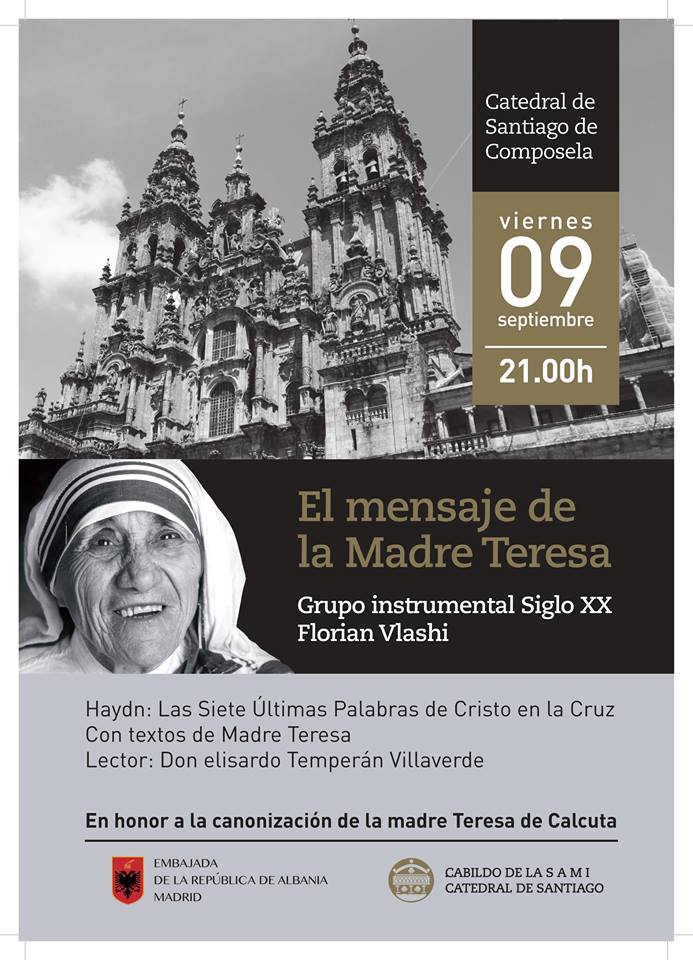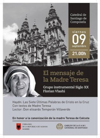La Catedral de Santiago de Compostela acoge mañana viernes a las 21 horas un concierto del Grupo Instrumental siglo XX,  en el que se interpretará la conocida obra de Haydn "Las siete últimas palabras de Cristo en la cruz". La versión se combinará con la lectura por parte de Elisardo Temperán Villaverde de textos de Santa Teresa de Calcuta. El violinista Florian Vlashi se hará cargo de la dirección musical, al frente de un conjunto del que también formará parte Enrique Iglesias (violín), Despina Ionescu (viola) y Rediana Lukaçi (Violonchelo). El concierto está patrocinado por la Embajada de la República de Albania en Madrid así como por el Cabildo de la Catedral de Santiago.