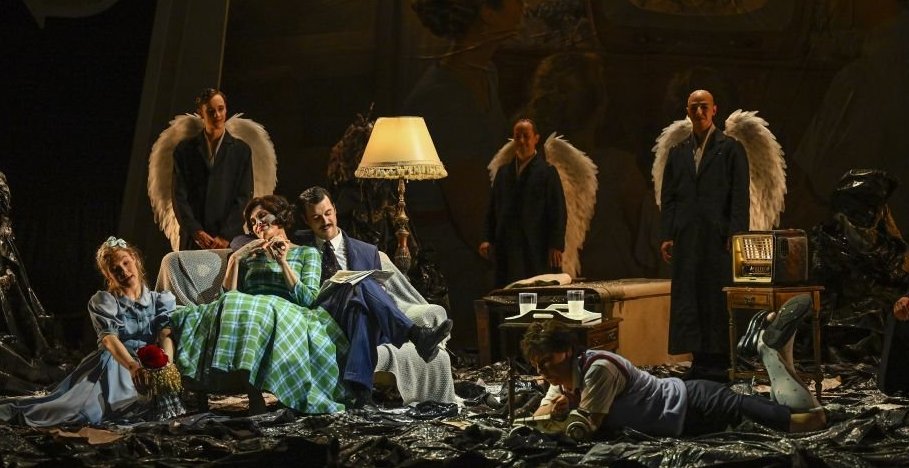 El segundo acto está presidido por un inmenso cartel con la típica imagen de familia feliz americana de los años 50 sentados en un sofá viendo la televisión y un gran letrero que reza “Nothing like our happy way of life” (“No hay nada como nuestro estilo de vida feliz”) y que costaba leer al estar situado sin apenas margen del límite superior del cartel, inundado además por las sombras que se generaban por las lámparas que pretendían en realidad iluminarlo -inteligente el cambio del suelo que, en un suspiro y ante los ojos del público, pasó de ser un estercolero a una enorme alfombra roja-. Se supone que esta imagen era a la que aspiraba la decrépita familia del cuento de Vázquez, aunque quizá hubiera sido más acertado, en esa línea, la famosa frase de El mago de Oz: “There´s no place like home” (“No hay lugar como el hogar”), que mantendría la idea del director pero lo acercaría más a la ópera de fantasía que es en realidad Hänsel y Gretel. Märchenoper (“Ópera de cuento de hadas”) es como en realidad se denominó en su estreno en 1893 en el Teatro de la Corte de Weimar, algo similar a la Opéra Féerie francesa y de alguna manera a la Zarzuela bufa de gran espectáculo de España; sin embargo, Raúl Vázquez, ha optado por desprenderse de toda esa grandilocuencia y fantasía que sin duda epataría al espectador y sería muy apropiada para la historia de un cuento infantil con una casa de caramelo como protagonista y una bruja que siempre da mucho juego. Lo que sí incluyó fue una escena sexual muy explícita y sin venir a cuento, nunca mejor dicho. Se optó por un tercer acto en rosa chicle en el interior de la casa de la bruja, que bien parecía una pastelería de tartas nupciales, adornada con grandes globos en su techo -de nuevo un elemento usado por Sagi en no pocas ocasiones- y una bruja a lo Señora Doubtfire pero en rosa monocromático, del que se iba desprendiendo a medida que se dejaba ver su maldad hasta quedarse en un vestidito negro. Fue la interpretación de Stéphanie Müther, con su modulación de voz al nasalizarla ocasionalmente a propósito y con sus dotes interpretativas, la que hizo que poco a poco viéramos al malvado, aunque un tanto torpe, personaje.