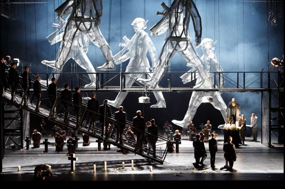 Carlos Wagner escribe en el programa que la historia de esta ópera trata un problema que, “para un público contemporáneo, se manifestó de manera muy inquietante en las guerras en torno a la división de la antigua Yugoslavia”. El director de escena ve la historia “Trágica y absurda” y, quizás por lo segundo, pone metralletas en las manos de los protagonistas y caracteriza al Duque como al rey Jerjes de la película 300, a la sazón un inquietante Ángel Ódena rapado y tatuado al moderno estilo septum que hoy tanto abunda, que incluso nos llevó a recordar los tatuajes del inolvidable arponero de Moby Dick interpretado en su día por Frederick Ledebur.