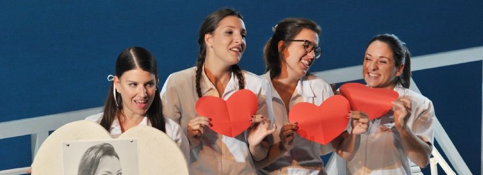 Emilio Sagi concibió esta producción para la Academia de cantantes del ROF (Rossini Opera Festival) de Pesaro en 2001. Una producción que aunque pronto alcanzará la mayoría de edad conserva la frescura y elegancia, señas de identidad de este regista, que le ha llevado a representarse en teatros de diversas partes del mundo más allá del ámbito pedagógico para el que fue concebido. El admirado y añorado maestro Zedda fue quien encargó este montaje y quien realizó la edición musical en el que la parte del coro es asumida por diversos solistas obedeciendo a unas indicaciones del mismo compositor. Visualmente la escenografía es única contrastando el blanco de la pasarela, sillas y parte del vestuario con un ciclorama azul y con el negro del vestuario elegantísimo de Pepa Ojanguren para la segunda parte de la obra. Pero no nos hemos de engañar… tras esta simplicidad minimalista de concepto hay un trabajo teatral que potencia y acerca los detalles interpretativos de los solistas al público arrancando sonrisas y aplausos tras cada aria o dúo y que crea una implicación en los intérpretes mucho mayor que en otros montajes más tradicionales.