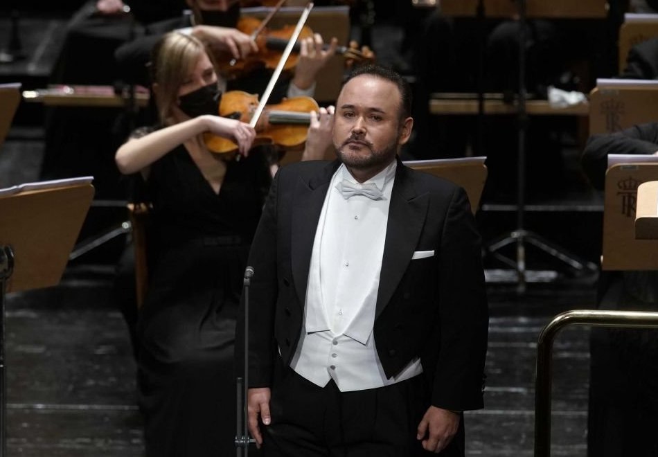 Una calurosa y amplia ovación saludó a Javier Camarena en su regreso al Teatro Real como muestra del cariño que le tiene su público, no en vano es la única estrella de la ópera actual que ha logrado fidelizar el recinto de la Plaza de Oriente. La cavatina «Ah leve toi soleil» de Romeo y Julieta de Gounod puso de relieve a un tenor inseguro, con el sonido sin liberar y nada cómodo en los ascensos, que se resolvieron con apoyo en una nota anterior (portamento di sotto, al objeto de asegurar la nota), sin punta y un tanto forzados. Mejor resultó la aubade de Mylio de la ópera Le roi d’Ys de Lalo escanciada con gusto por el tenor y con un par de ascensos en falsettone, desvaído el primero de ellos, con más timbre y apoyo el segundo. Las dos últimas intervenciones de Camarena en la primera parte correspondieron a ópera francesa de autor italiano, en este caso el genial bergamasco Gaetano Donizetti. En primer lugar, la grand opera Dom Sébastien Roi de Portugal, de la que el tenor mexicano ofreció la espinosa aria «Seul sur la terre», más conocida en su versión italiana «Deserto in terra» interpretada y grabada por eximios tenores incluidos Enrico Caruso y el propio Alfredo Kraus en su disco «The incomparable Alfredo Kraus» registrado por el inigualable tenor canario bien superada la sesentena. Camarena mostró en la exigente pieza, que su registro agudo, una de sus armas genuinas, se iba asentando, aunque sin terminar de ganar esas notas la expansión y el brillo que otrora ostentaron. «Je suis joyeux» –«Allegro io son» en la versión italiana- de la ópera cómica Rita ou le mari battu permitió a Camarena mostrar su tan particular como eficaz bis cómica, plena de desenvoltura y comunicatividad, como puso de relieve en su día en su exitoso debut en el Teatro Real con La fille du regiment del propio Donizetti. Previamente, el tenor mexicano se dirigió al público para referirse a la pesadilla que en forma de pandemia asola el Mundo en los últimos meses, agradecer al Teatro Real su admirable contumacia en seguir manteniendo sus espectáculos y programación y reivindicar la importancia de la cultura en cualquier sociedad que se pretenda civilizada.