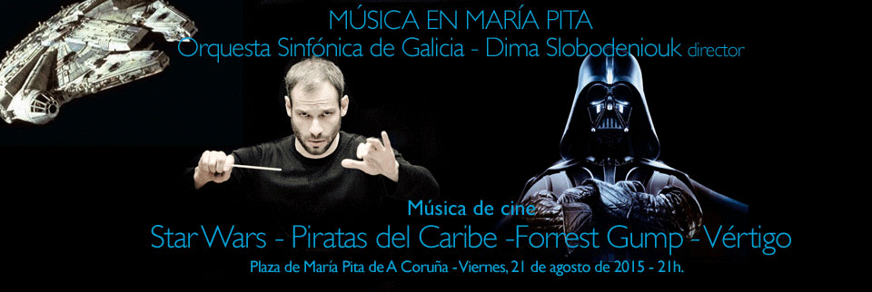 Mañana viernes, la Sinfónica de Galicia ofrece un concierto a las 21:00 horas, en la Plaza de María Pita, bajo la dirección de su titular, Dima Slobodeniouk, centrado en las más conocidas bandas sonoras cinematográficas. La cita permitirá oír la música de películas como Star wars, Forrest Gump, Piratas del caribe y Vértigo. Los días 22 y 23 de agosto serán la Orquesta Joven y el Coro Joven de la OSG los que tomarán el relevo, con un programa en el que sonarán El amor brujo de Manuel de Falla y la Sinfonía nº 5 de Dmitri Shostakóvich.