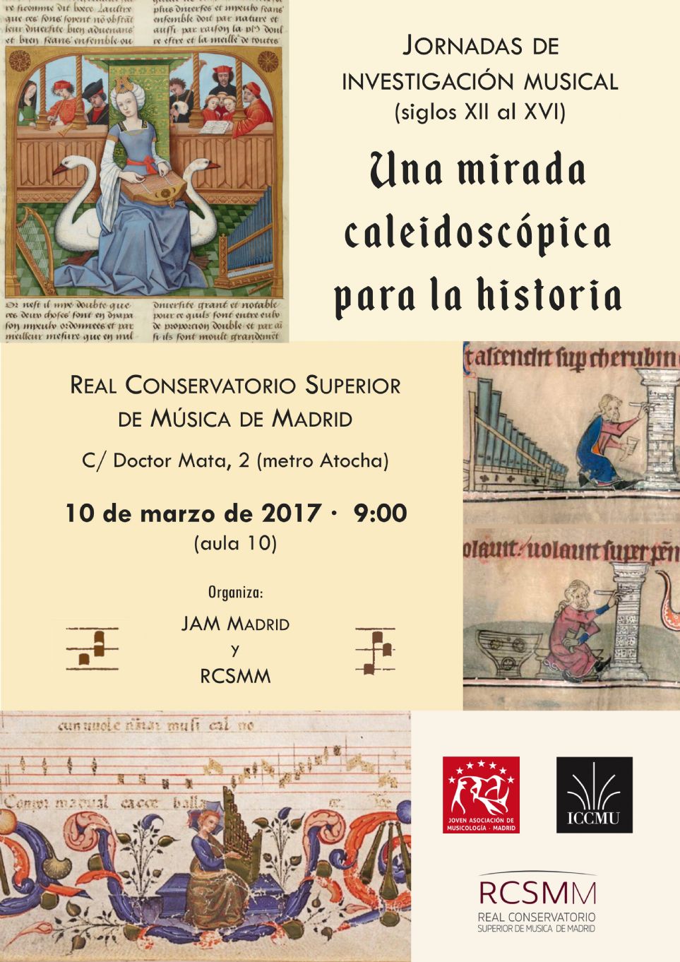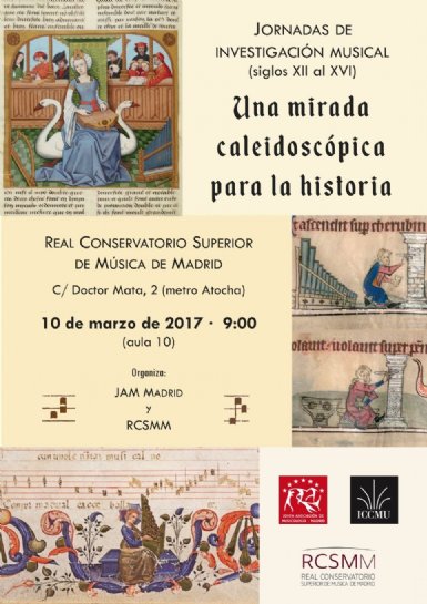 La Joven Asociación de Musicología de Madrid (JAM Madrid) y el Real Conservatorio Superior de Música de Madrid (RCSMM) aúnan sus fuerzas para presentar unas Jornadas de Investigación que abarcan de los siglos XII al XVI y que tendrán lugar en el conservatorio madrileño el viernes 10 de marzo de 2017.