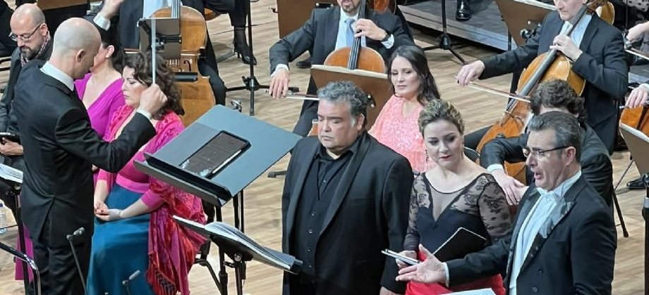 Madrid. 9-II-2024. Teatro Monumental. Ciclo Clásica Monumental. Concierto A11. Obras de Juan José Colomer (1966) y Manuel de Falla (1876-1946), La vida breve. Carmen Solís, soprano (Salud); Cristina Faus, mezzosoprano (la abuela); Aquiles Machado, tenor (Paco); Esmeralda Espinosa, mezzosoprano (Carmela); Carmelo Cordón, barítono (Manuel); Óscar Fernández, barítono (El tío Sarvaor); César Arrieta, tenor (Voz de la fragua); María Mezcle, cantaora; Juan Manuel Cañizares, guitarra; Antonio Najarro, bailaor; Raquel González y María del Mar Martínez, sopranos (vendedoras); Amparo Zafra, contralto (vendedora); Matías Álvarez, tenor. Orquesta Sinfónica y Coro de RTVE. Marco Antonio García de Paz, director del Coro RTVE. Guillermo García Calvo, director.