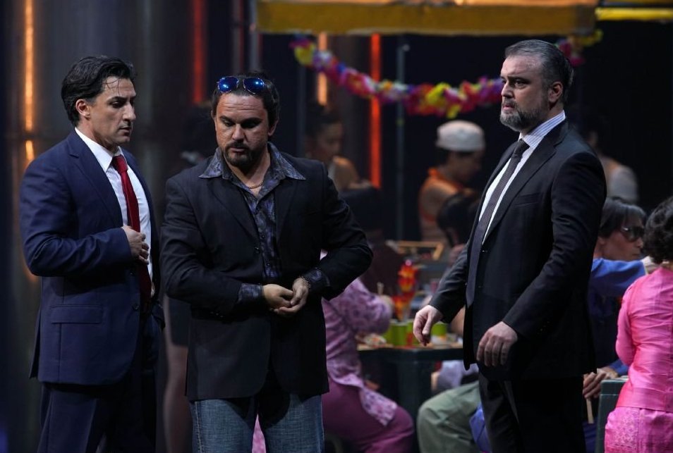 La escenografía de su habitual colaborador Paolo Fantin nos sitúa en los bajos fondos de una ciudad asiática indeterminada. Ni Nagasaki, ni su puerto, ni su colina. Luces de neón, anuncios lúbricos de muchachas, otros de hamburguesas, rodean la supuesta casa – en este caso parece un lupanar en el que deambulan las muchachas prostitutas- que adquiere Pinkerton junto a la esposa Cio-Cio-San por 999 años con capacidad para rescindir cuando le plazca. Por supuesto, Pinkerton no es marino, es más bien un menorero adicto a la prostitución vestido como un ejecutivo y Goro, más que un casamentero, es un traficante de mujeres o más bien, niñas.