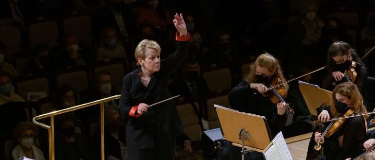 El concierto comenzó con una obra contemporánea encargo de la orquesta y que se presentaba en España, después de su recientísimo estreno en Viena y estará presente en toda la gira por tierras españolas que asumirá la agrupación. Heliosis de la jovencísima compositora, aún veintiañera, Hannah Eisendle, describe una escena veraniega con un Sol intenso mediante acusados contrastes rítimicos, abundante uso de la percusión y unas cuerdas que deben tocarse constantemente detrás y sobre el ponticello. Un comienzo que recuerda a Stravinsky y algunas tímbricas interesantes fueron derivando a ecos de John Williams y Lalo Schifrin sin terminar de emerger una verdadera personalidad. Alsop y la orquesta tocaron impecablemente la pieza demostrando la solvencia técnica y seguridad de la primera y la buena calidad sonora de la segunda.