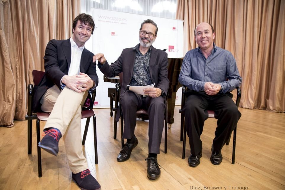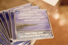 La Sala Manuel de Falla de la SGAE de Madrid acogió ayer la presentación del CD "Guitar concertos", una grabación que recoge por primera vez el Concierto de Benicàssim de Leo Brouwer y Guitare, de Martin. El disco, que ha sido grabado por el prestigioso ingeniero de sonido Fernando Arias, tiene como protagonistas interpretativos a la Real Filharmonía de Galicia, al director de orquesta Óliver Díaz y al guitarrista Miguel Trápaga, que también ofrece en el trabajo su versión del Concierto de Aranjuez de Joaquín Rodrigo. Además de Óliver Díaz y Miguel Trápaga, asistieron a la presentación del disco el musicólogo Emilio Casares y el compositor cubano Leo Brouwer.