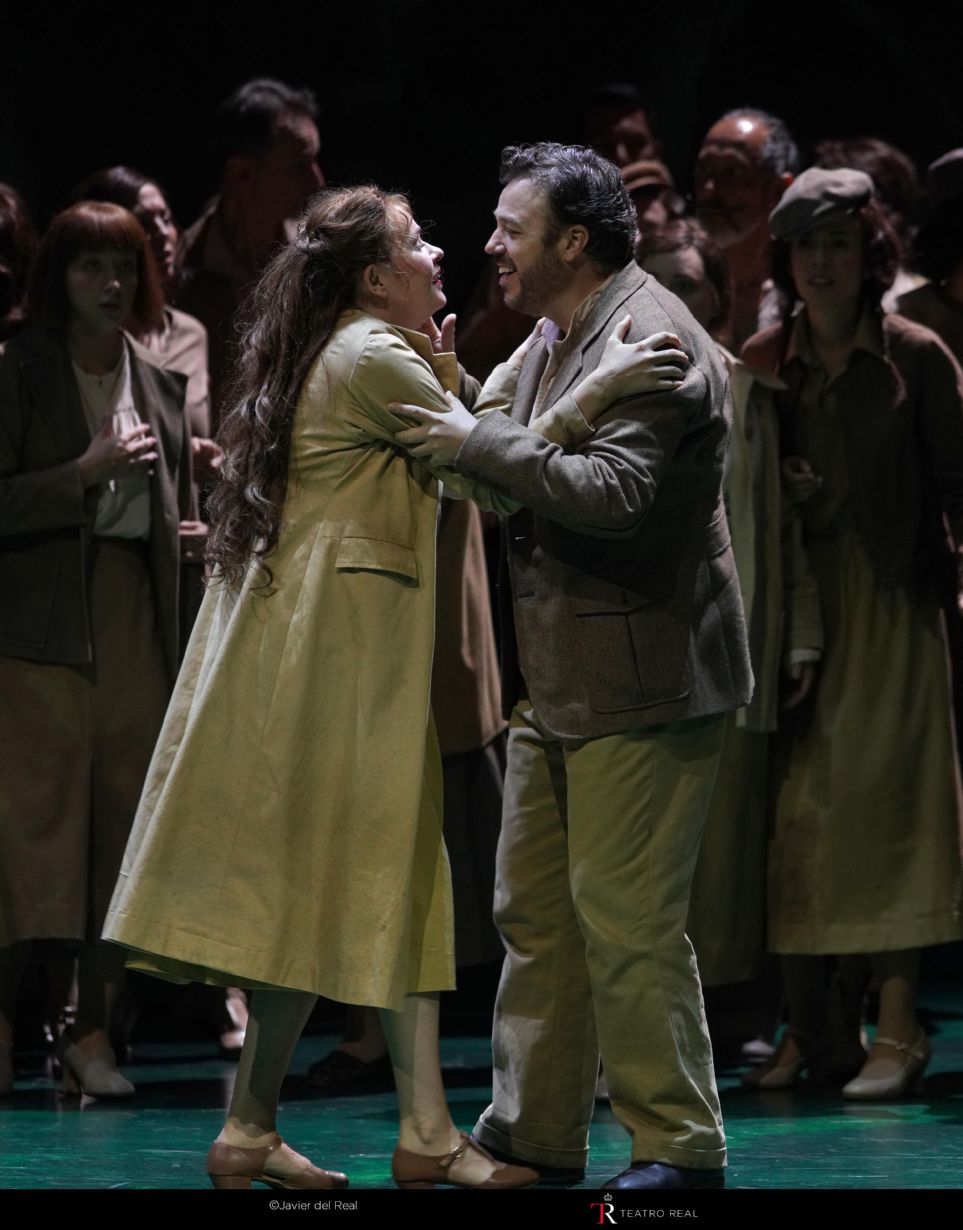 Por todo lo expuesto, la puesta en escena de Andreas Homoki basada en una desnuda escenografía de Wolfgang Gussmann, que se fundamenta en un enorme y agotador panel móvil nace desnortada de partida, pues intenta imponer un drama familiar íntimo en este gran fresco coral donde el colectivo ostenta todo el protagonismo. Al socaire de esa identificación del pueblo italiano ansioso de libertad y unidad política con los esclavos hebreos, la producción se sitúa temporalmente en la época del estreno, algo poco original, desde luego. Los asirios se convierten en los austríacos, que portan suntuosos vestidos, imbuidos en un omnipresente verde, y los hebreos son los italianos ataviados humildemente, a la manera de la pintura «El cuarto Estado» de Giuseppe Pellizza da Volpedo. Lo cierto es que el montaje recuerda en cierto modo al de El barberillo de Lavapiés de Alfredo Sanzol, recientemente repuesto en el Teatro de la Zarzuela, en el que un juego de paneles en un escenario desnudo se mueve torpemente y estorba el movimiento escénico. En la producción de Homoki sólo hay un panel, pero es una pared colosal que estorba aún más y el constante colorido verdoso termina cansando no poco. El movimiento escénico oscila entre lo torpe y lo absurdo. Rídiculos, reamente sonrojantes, los bailecitos del coro en la cabaletta de Abigaille, absurda la presencia constante en escena de ésta y Nabucco. ¿Qué pintan en la primera parte del coro de esclavos? La regia intenta imponer sin éxito una dramaturgia basada en el conflicto familiar de un padre y dos hermanastras encarnadas por dos muchachas-meninas de machacona presencia sobre el escenario. Todo baldío, pues, es preciso insistir, los protagonistas de Nabucco son los dos colectivos, los dos pueblos, el opresor y el oprimido y a pesar del cambio de época, la puesta en escena carece de todo impulso o dimensión risorgimentale. En resumen, realmente fallida, bajo todo punto de vista, la producción con la que el Teatro Real en coproducción con la Ópera de Zurich recupera Nabucco después de una ausencia de 151 años. En la temporada de ópera «oficial» de Madrid, Nabucco no se representaba desde 1971 en el Teatro de la Zarzuela bajo la dirección de Nino Sanzogno y protagonizada por Cornell MacNeil y Elena Souliotis.