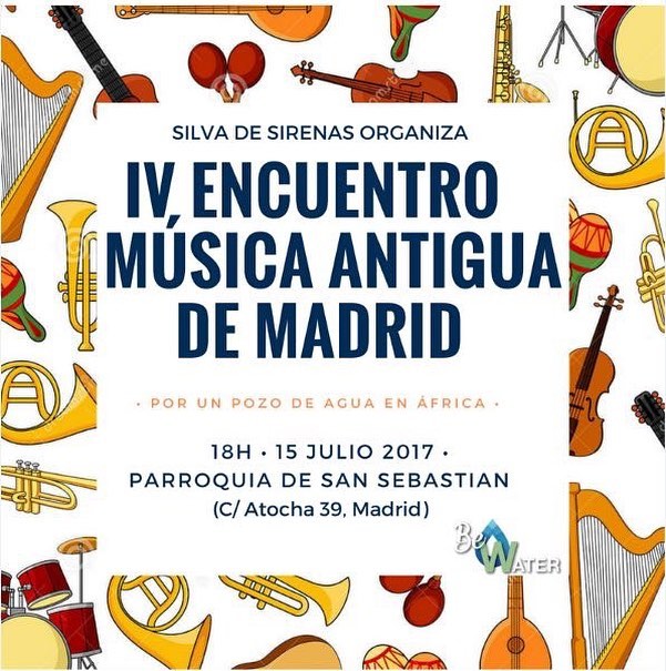 Como colofón al IV Encuentro de Música Antigua de Madrid, Silva de sirenas, el sábado 15 de julio se llevará a cabo el concierto solidario Por un pozo de agua en África, en el que, en colaboración con la ONG Be Water, se podrán escuchar las obras trabajadas por los asistentes al curso y los profesores con un fin solidario. Se trata de una oportunidad de disfrutar del repertorio escogido para este IV encuento, bajo el doble de título De Monteverdi a Telemann y Polifonía e instrumentos en el siglo XVI; la voz, el texto y la danza. El concierto tenrá lugar en la Paroquia de San Sebastián (Atocha, 39), a las 18:00, con entrada libre y aportación voluntaria para el desarrollo de este proyecto solidario.