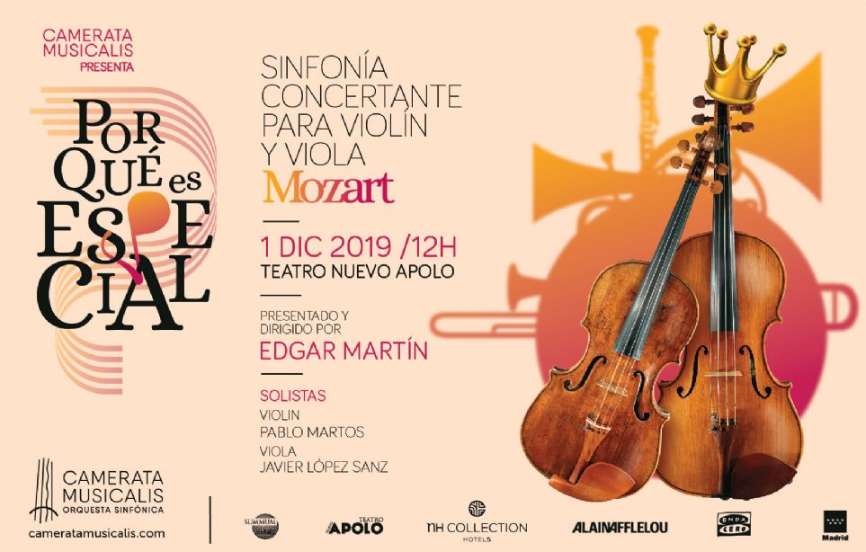Dos intérpretes españoles como invitados de excepción serán los protagonistas del Por qué es especial que cerrerá el 2019, como es habitual, el primer domingo de mes [1 de diciembre] a las 12:00, en el Teatro Nuevo Apolo de la capital madrileña. El violinista Pablo Martos y el violista Javier López Sanz interpretarán, junto a la Orquesta Camerata Musicalis, la Sinfonía concertante para violín y viola en mi bemol mayor, KV 364, de Wolfgang Amadeus Mozart, una de las obras más emocionantes del mítico músico austriaco, compuesta en pleno duelo tras la muerte de su madre. Como es costumbre, en la primera parte de la velada los espectadores podrán asistir a las explicaciones ofrecidas por el director musical de las agrupación y divulgador musical, Edgar Martín, que en tono desenfadado y con la presencia de la actriz Marta Belenguer como tercera invitada de excepción –haciendo las veces de Nannerl Mozart–, convertirán el escenario en una lucha instrumental arbitrada por el propio Martín. «El público va a alucinar con el talento de Pablo Martos y Javier López Sanz y con la obra del Mozart más cañero, que hace dialogar al violín y a la viola como nadie lo había hecho hasta entonces. Este Por qué es especial es un verdadero espectáculo musical que no debe perderse nadie, en especial quienes tengan ganas de aprender y divertirse escuchando la mejor música clásica», dice Martín, creador de Por qué es especial.