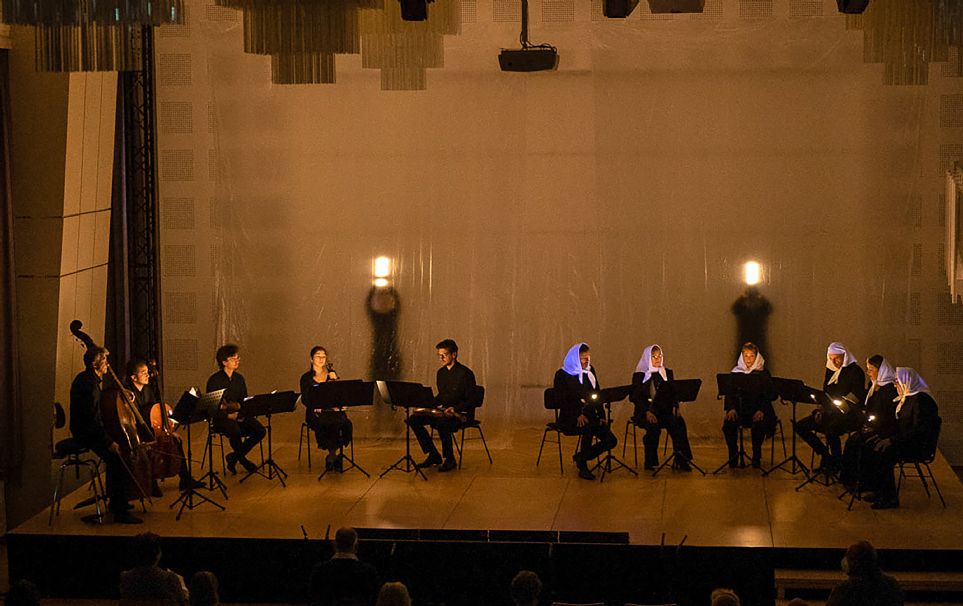 En torno a la interpretación de la música del compositor italiano Gesualdo y otros autores, como Henry Purcell, John Dowland, Giovanni Maria Trabaci o Biagio Marini, Davide y Giusspe di Liberto han concebido un dispositivo teatral basado en diversos ritos del sur italianos relacionados con la muerte. La música será interpretada por dos formaciones prestigiosa italianas, La Compagnia del Madrigale, especializada en el repertorio madrigalesco de la Italia tardorenacentista, y el conjunto instrumental Il Pomo d'Oro. Las piezas que se han elegido para este espectáculo sugieren una continua alternancia entre una marcada dimensión espiritual y una tensión terrenal, humana y material. De esta manera, los elementos principales que componen la escenografía serán láminas de plástico en forma de velos verticales que dividen el espacio de una forma que sigue siendo penetrable con la mirada: las láminas de celofán asumirán, de hecho, la función de crear un entorno con una carga espiritual y atemporal concreta. Estos velos se iluminan con focos de luces inferiores que apuntan hacia arriba y emiten una luz cálida que recuerda a la de las velas votivas que alumbran las capillas mortuorias. De esta forma, el espectáculo asume un valor ritual, con dos escenas fundamentales para la narración dramatúrgica y poética: la apertura y el cierre del espectáculo.