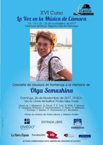 La Sala de Cámara del Auditorio de Oviedo acoge este domingo 26 de noviembre un concierto homenaje dedicado a la pianista recientemente fallecida Olga Semushina. La cita sirve para clausurar el XVI curso de música "La Voz en la Música de Cámara", organizado por la asociación cultural La Castalia. En el concierto se interpretarán obras de Massenet, Fauré, Tosti, Wolf, Strauss, Rachamninoff y Rodrigo, entre otros, además de estrenarse dos obras, de los españoles Pablo Moras y Gabriel Ordás. La entrada es libre.