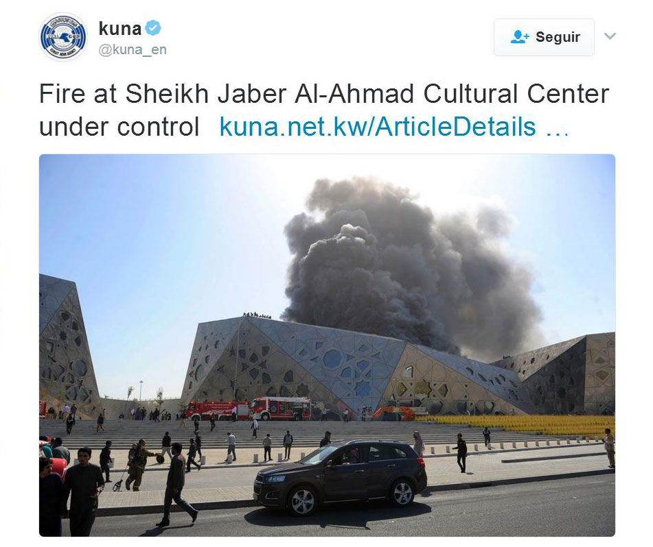Según información publicada en Télam, un incendio de grandes proporciones afectó este lunes al edificio de la ópera del Centro Cultural Jeque Yaber al Ahmed en Kuwait, el lujoso complejo arquitectónico inaugurado hace tres meses en el centro de la capital kuwaití. Según informa el mismo medio citando a EFE, el fuego ha sido controlado por los bomberos y no ha habido que lamentar ninguna víctima, "pero todavía no se han cuantificado los daños materiales".