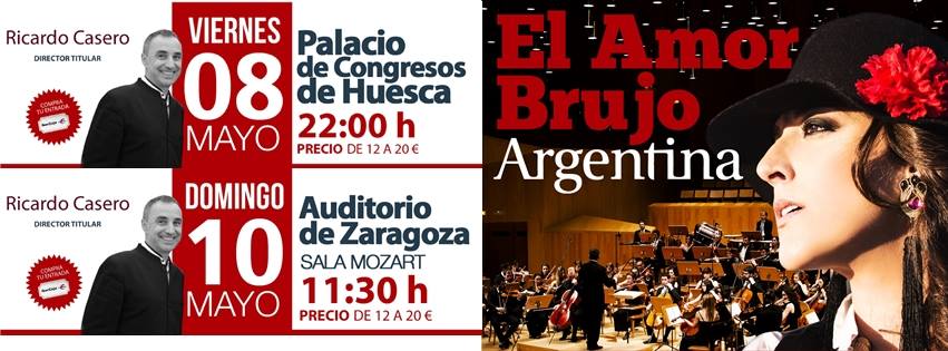 La Orquesta Reino de Aragón continúa en su empeño por ofrecer una temporada estable de conciertos a lo largo del año en Aragón. En este sentido, llegan ahora dos conciertos en Huesca y Zaragoza, los días 8 y 10 de mayo respectivamente, con el gran atractivo de El amor brujo de Manuel de Falla con la cantaora Argentina. Bajo la batuta de su director titular, Ricardo Casero, la formación interpretará asimismo obras de Bizet (las suites de Carmen y L´Arlésienne) y Fauré (la suite Pelléas et Mélisande). La Orquesta Reino de Aragón es formación residente en el Palacio de Congresos de Huesca y asimismo la orquesta titular de la Asociación Aragonesa de la Ópera. La cantaora Argentina, nominada a los Grammy, presenta su interpretación de la obra de Falla en Aragón días antes de hacerlo en EEUU con la Filarmónica de Los Ángeles y Gustavo Dudamel. Las entradas para ambos conciertos pueden adquirise por un precio entre 12 y 20 €. El concierto del día 8 tendrá lugar a las 22 h. en el Palacio de Congresos de Huesca y el del día 10 se celebrará a las 11.30 h. en el Auditorio de Zaragoza.