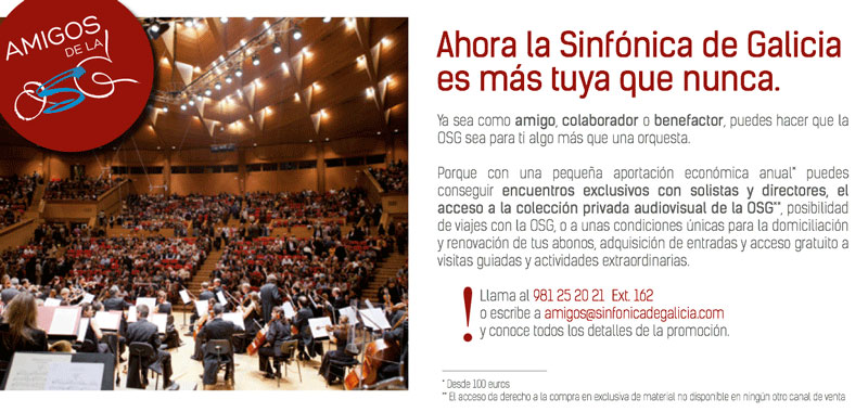 Los Amigos de la OSG contribuirán con sus diferentes aportaciones filantrópicas a la financiación del proyecto artístico de la Orquesta Sinfónica de Galicia, lo que conllevará desgravaciones fiscales al tiempo que ventajas dentro de la institución, como disfrutar de un período especial para adquirir entradas, asistir a ensayos generales y actividades extraordinarias. Para conocer todos los detalles de la promoción, existe un teléfono de contacto (981 25 20 21 Ext. 162) y un e-mail: amigos_arroba_sinfonicadegalicia.com
