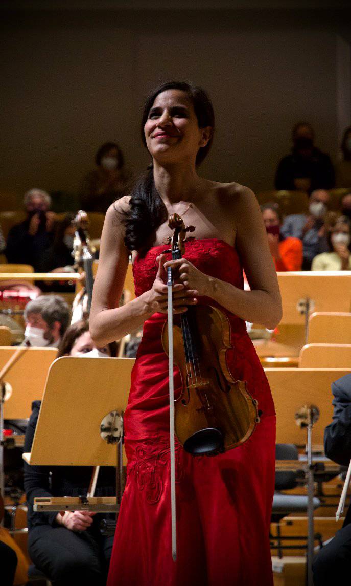 Pero además de escucharla hay que verla, con esas danzas pivotantes de tronco y brazos, en torno al instrumento, donde vimos desgastar literalmente el arco -observamos que tuvo que retirar hilachas del mismo durante la ejecución-, en un apasionamiento que además supo relativizar perfectamente para diferenciar las partes de Allegro moderato y Romance, dotando al sonido de su instrumento de excelente ampulosidad, elegancia y volumen, así como administró muy adecuadamente los cantábile de violín solista de muchos quilates.
