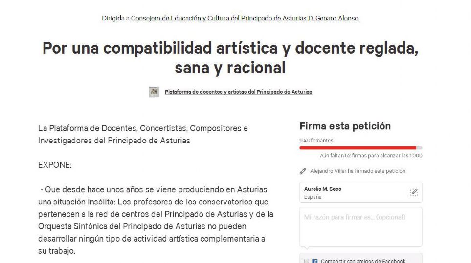 ¿Crees que los profesores de conservatorio también tienen derecho a poder desarrollar una carrera musical? La Plataforma de Profesores, Concertistas, Compositores e Investigadores del Principado de Asturias ha lanzado una petición en Change.org dirigida al Consejero de Educación y Cultura del Principado de Asturias, Genaro Alonso, con el objetivo de recoger apoyos para que el Gobierno del Principado de Asturias articule urgentemente soluciones jurídicas para permitir la actividad artística de sus profesores.