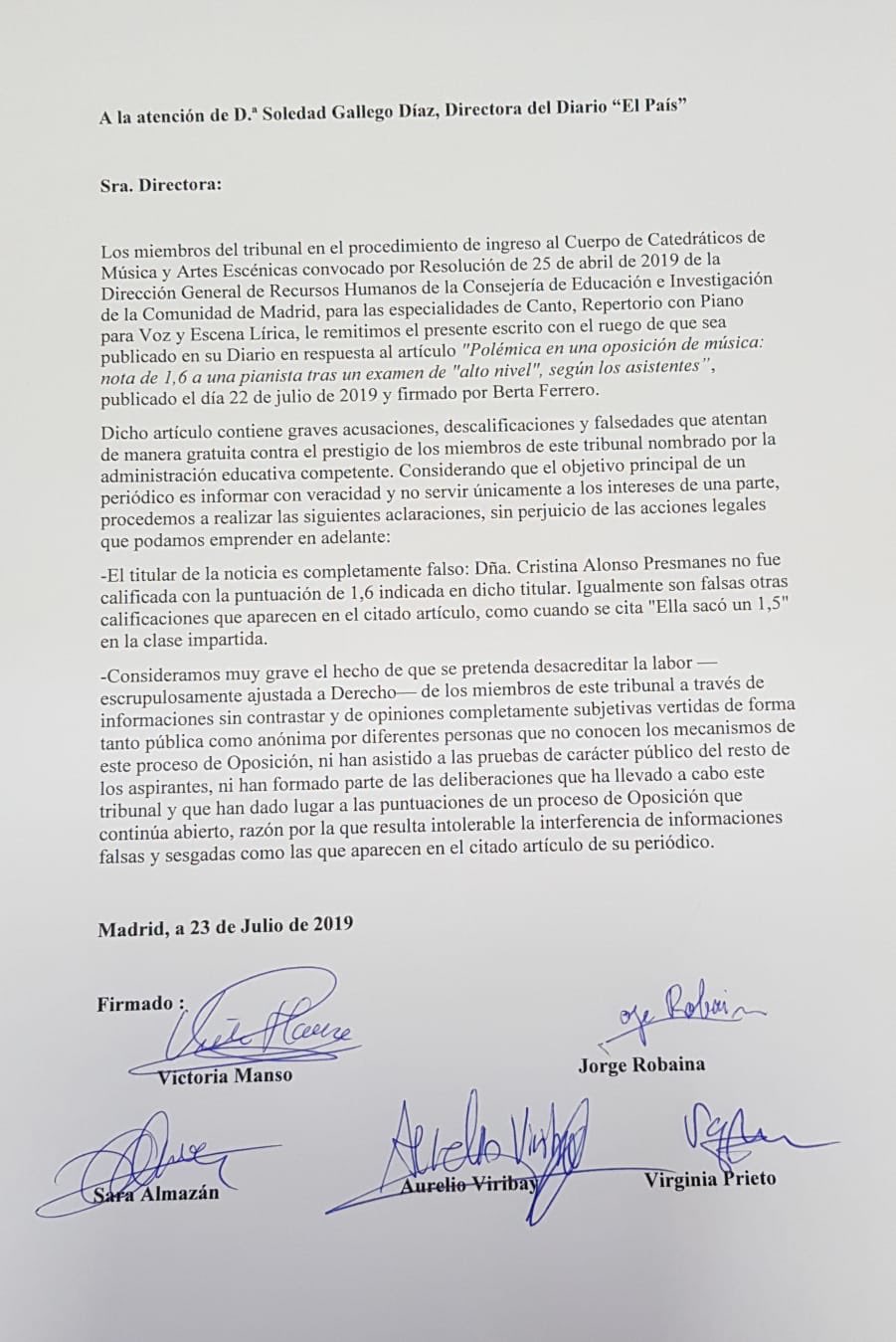 Un día después llega la respuesta de los miembros del tribunal. Victoria Manso, Aurelio Viribay, Virginia Prieto, Jorge Robaina y Sara Almazán acaban de hacer pública una carta a través del Twitter de Viribay, en la que trata de desmentir lo publicado por El País. «Dicho artículo», escriben los firmantes refiriéndose al publicado por el diario, «continene graves acusaciones, descalificaciones y falsedades que atentan de manera gratuita contra el prestigio de los miembros de este tribunal nombrado por la administración educativa correspondiente. Considerando que el objetivo principal de un periódico es informar con veracidad y no servir únicamente a los intereses de una parte, procedemos a realizar las siguientes aclaraciones, sin perjuicio de las acciones legales que podamos emprender en adelante».