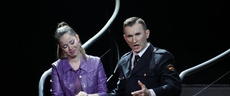El reparto dominado por cinco personajes principales estuvo bien servido tanto en el aspecto musical, como en el escénico. Desconozco las razones de la ausencia del barítono santanderino Manuel Lanza, que figuraba como protagonista de la obra desde su primera programación e incluso aparece en las fotos del programa de mano editado por el Teatro de la Zarzuela. Su sustituto fue el templado barítono César San Martín, de timbre gris y un punto gutural, pero canto aplicado y buena encarnación escénica del político corrupto al que todos podemos poner, desgraciadamente, muchos nombres y apellidos. Un tanto envarado y afectado en los diálogos se manifestó Miguel Ángel Arias, con un material avaro en brillo y color, más cercano a un barítono que a un bajo, aunque con cierta sonoridad y una apropiada implicación escénica como policía. Su hija fue encarnada por la soprano rondeña Alba Chantar, que acreditó frescura y desenvoltura juvenil en escena y un timbre sopranil limitado de presencia y volumen, pero bien colocado, encauzado por un fraseo cuidado y musical, así como una buena técnica de pasaje. La también soprano María Hinojosa en el papel de esposa del político corrupto que se fuga con la tela, acreditó mayor volumen y metal, aunque no pudo librarse de vibrato en su emisión y alguna nota desabrida a la hora de enfrentarse a una escritura vocal trufada de agilidad aérea. Tan grato como liviano el timbre del tenor venezolano César Arrieta que asumió el papel del más bien insulso hijo del presunto implicado que se enamora de la hija del policía que le persigue y encarcela.