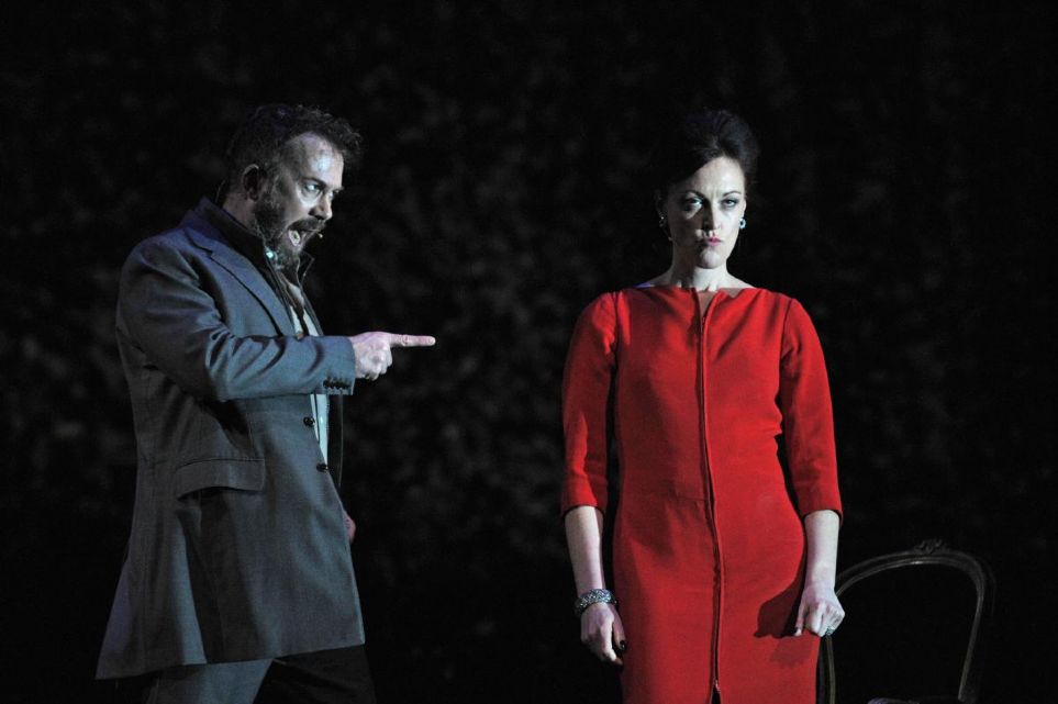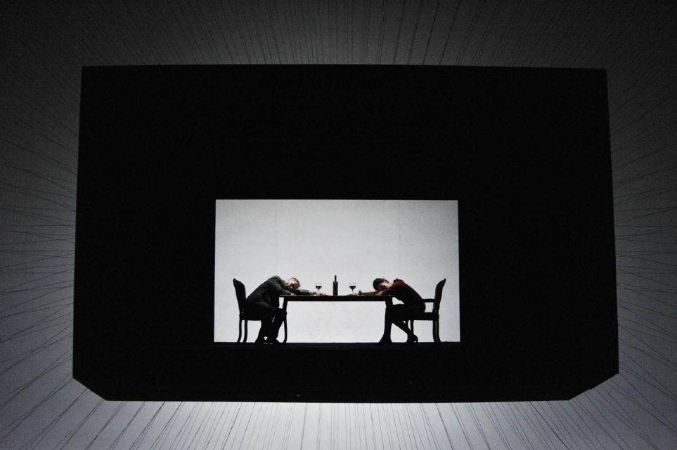 Barcelona, 3-III-2017. Gran Teatro del Liceo. Quartett, libreto y música de L. Francesconi sobre la obra teatral homónima de H. Müller. Puesta en escena: Àlex Ollé (La Fura dels Baus). Escenografía: Alfons Flores. Vestuario: Lluc Castells. Iluminación: Marco Filibeck. Vìdeo: Franc Aleu. Realización informática musical-IRCAM: Serge Lemouton. Ingeniero de sonido- IRCAM: Sébstien Naves. Producción informática musical IRCAM: Benoît Meudic. Grabación, edición y mezcla de la grabación del coro y orquesta del Teatro alla Scala: Julien Aléonard. Intérpretes: Robin Adams (barítono) y Allison Cook (soprano). Orquesta del Teatro. Dirección musical: Peter Rundel.