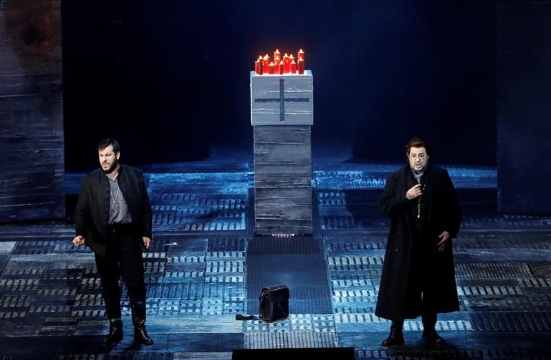 La producción de Marco Arturo Marelli (a cargo de la dirección de escena y la escenografía) procedente de la Deutsche Oper de Berlín se basa en paneles que se desplazan constantemente y enmarcan la acción y los lugares en los que se desarolla la misma, con presencia constante de la cruz, enfatiza el conflicto político, resultando ejemplo de ello, la escena del auto de fe en el que los rebeldes protestan ante el poder tiránico y oscurantista y esa religión de Estado intolerante y fanática, siendo reprimidos cruelmente por la autoridad. Negros y grises que simbolizan ese dominio absoluto y despótico, rojos en los ministros de esa iglesia que reúne más poder que el propio trono, que evocan la sangre que corre de los “infieles”. Final de efecto con el fusilamiento del infante y los rebeldes flamencos. El movimiento escénico está bien trabajado en un montaje que funciona aceptablemente. Éxito indudable. El público disfrutó y aplaudió con entusiasmo.