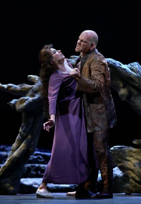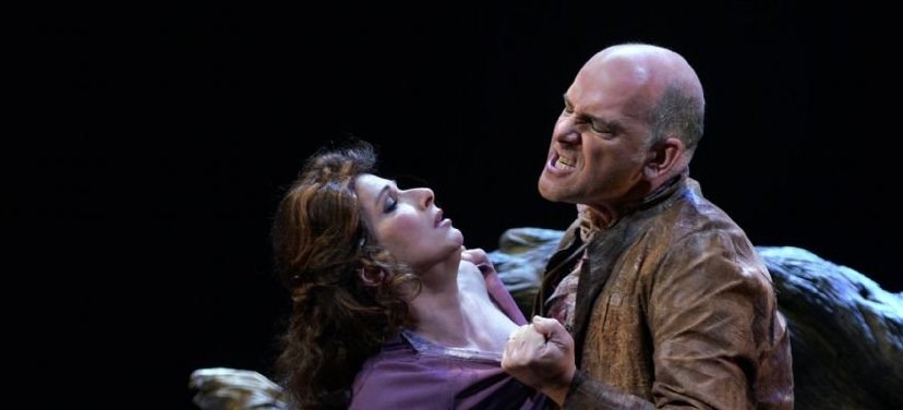 El teatro de la Calle Jovellanos reponía la producción de José Carlos Plaza que se había estrenado en la temporada 2011-2012 y sustituía a la anterior de Emilio Sagi de la 1992-93, que giró con gran éxito por lugares como Tokio, Puerto Rico, Los Angeles y Washington con la dirección de Miguel Roa y Plácido Domingo como estrella, quien, sin embargo, no cantó en las funciones de Madrid, de las que el que suscribe presenció una, y fue sustituido por los tenores Antonio Ordóñez y César Hernández. Como contraste frente al colorista montaje de Sagi, esta producción, de tinte oscuro, entronca con la recientemente vista en el Teatro Real de Carmen, -una obra con la que “El gato Montés” presenta tantas concomitancias-, ya que, con escenografía escueta de Francisco Leal, incide en esa España profunda y sombría de la incultura, los atavismos, el fanatismo religioso, el cerrilismo, los celos irracionales y esos amores desbocadamente apasionados que conducen a la tragedia. El color lo aporta el estupendo vestuario de Pedro Moreno y puede decirse que el montaje funciona aceptablemente, pues caracteriza bien los personajes, mueve bien a los mismos y resuelve asumiblemente las difíciles escenas del acto segundo con la corrida de toros. Si bien ese manejo del capote en la oscuridad tiene poco de torero y parece más “jugar a hacer el fantasma con una sábana” como hacíamos de pequeños.