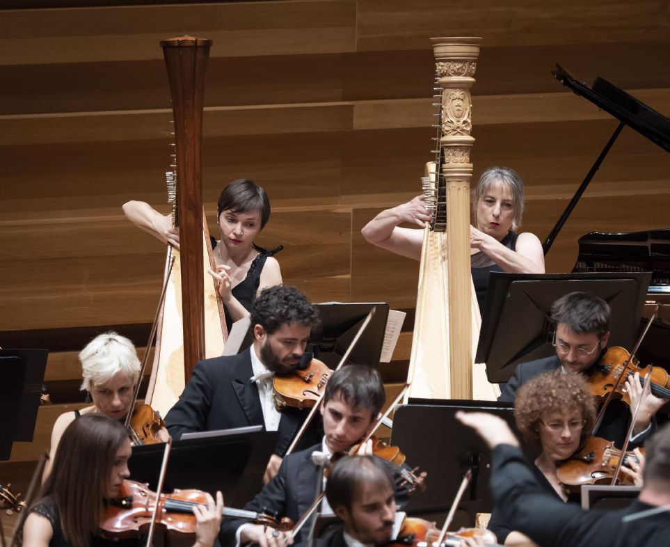 Marianne ten Voorde desde el arpa, ese instrumento tan maravilloso y particular, que parece estar en un aparte, pero que no deja de notarse cuando suena aportando un color diferente a la orquesta. «Hacía mucho que no tocaba en el auditorio, pues yo durante el verano no actué en los sitios abiertos a los que fueron los ensembles de la orquesta, así que no veía a mis compañeros. No me había visto en esta situación y el regreso ha sido bastante emocionante». Una vuelta que ella considera «bastante feliz». «Aunque nos vemos con mascarillas, a cierta distancia y en petit comité, en la Sinfonía de Mahler el arreglo de Farrington es resultón, suena casi a la sinfonía entera». Yo de repente -prosigue ten Voorde- he cambiado muchísimo, porque no solamente toco la parte de arpa sino otros papeles, lo que me produce una sensación algo extraña ante una música que conozco de arriba a abajo, pero de manera diferente». Una situación que, al tiempo que desea, le hace sentirse algo extraña a la arpista. «Todos estamos a mucha distancia, no se comparte atril, y en la sala han trabajado para condenar las butacas que no van a usarse con largas cintas, que hace que parezca una performance, incluso la mascarilla me quita algo de visibilidad cuando miro hacia las cuerdas, y eso es algo a lo que hay que acostumbrarse, por lo que estudio en casa con mascarilla».