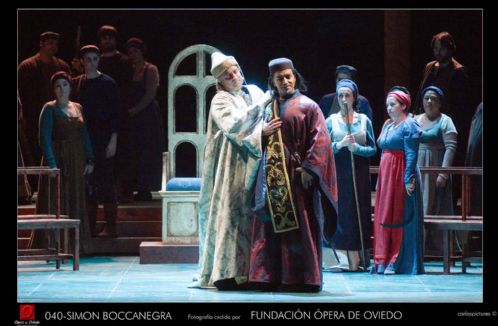 La producción, procedente de la Ópera de Santa Fe, resultó muy poco sugerente. Alguien entre bambalinas se lo habrá pasado de miedo haciendo girar el cubo que ocupaba el centro del escenario, pero la idea no funcionó, y no sólo por la fealdad de la construcción, sino porque el objeto en sí parecía molestar más que ayudar o generar posibilidades para el movimiento en escena. La dirección de actores resultó muy poco convincente, e incluso facilona. Al final de la ópera, por ejemplo, resultaba extraño e incluso ridículo ver como padre e hija optaban por separarse del todo, ante la inminente muerte del primero.  El movimiento escénico resultó confuso. Visualmente, no hemos conseguido encontrar en la producción ni un solo momento especialmente llamativo, a pesar de haberlo buscado con insistencia. No obstante, ni las paredes pintadas de un horroroso azul, ni un uso de las luces sin inspiración y con fallos intermitentes, ni un vestuario ni una caracterización demasiado típicas, consiguieron hacer olvidar los continuos y terribles giros de la caja central, a la que sólo le faltó explotar para terminar de dar el espectáculo por sí misma. Dejando la puesta en escena a un lado lo antes posible, y centrándonos en el reparto, hay que reconocer que la producción se resintió muchísimo por la cancelación de Carlos Álvarez, pero también es justo decir que, ni con él interpretando el papel protagonista, esta versión hubiera logrado alzar el vuelo, porque hay en ella demasiadas cosas que fallan. Del elenco el que mejor lo hizo fue Vitalij Kowaljow, bajo de calidad que dominó los registros líricos de Fiesco, e incluso dotó al personaje de un cierto carisma y carácter, cosa extraña en una noche donde el carácter faltó del todo. Marco di Felice es un barítono de oficio, que ofreció una lectura lirica correcta de Boccanegra. En escena le faltó carisma por todos los poros del personaje, y cantando se echó en falta más voz, profundidad expresiva y volumen. Ángeles Blancas es una soprano muy dotada para la escena, gracias a un físico atractivo y un talento dramático extraordinario. Lo que resulta extraño en esta intérprete, y muy preocupante, es que no se dé cuenta de su irregular estado lírico. De hecho, sus defectos vocales fueron tan evidentes que no se pueden interpretar como algo puntual, sino como una clara falta de perspectiva respecto a su situación artística. El problema de su respiración, con sonoras y desagradables inspiraciones antes de cada emisión, no se da ni siquiera en los más jóvenes y primerizos cantantes. Tampoco es normal que su voz suene tan engolada y nasal, una cuestión que afea mucho su imagen lírica. De su trabajo nos quedamos con sus condiciones dramáticas, que son todo un privilegio para los sentidos, pero que, para una cantante de su altura artística, no pueden resultar suficientes. El Coro de la Ópera de Oviedo volvió a cantar bien, aunque tampoco habría estado mal que se hubieran aumentado el número de componentes, ni que las sopranos afrontaran ciertos pasajes agudos con una línea de canto menos crispada. Giuseppe Gipali resultó un Adorno correcto, pero nada más, porque se echó muchísimo de menos una voz de tenor con mucho más cuerpo y volumen. Paolo Pecchioli interpretó la maldad de Paolo con profesionalidad y justos medios líricos. En escena tampoco acaparó las miradas. Víctor García Sierra fue un Pietro de garantías, y José Tablada y Vanessa de Riego, un Capitán y una Sirvienta conseguidos. El público reaccionó al final de la obra como tenía que reaccionar, de manera tibia, con aplausos de educación y reconocimiento hacia los artistas, más que de admiración hacia lo visto. La organización, sin embargo, respondió de otra manera. Intentar enmascarar los discretos resultados obtenidos queriendo confundir al público, retardando el encendido de las luces de la sala, está muy lejos de la honestidad artística con la que debería funcionar la Ópera de Oviedo, porque es como si al público se le llamase tonto a la cara, como si se le dijese: ¡no pare de aplaudir! ¿No ve que aún no hemos encendido las luces?