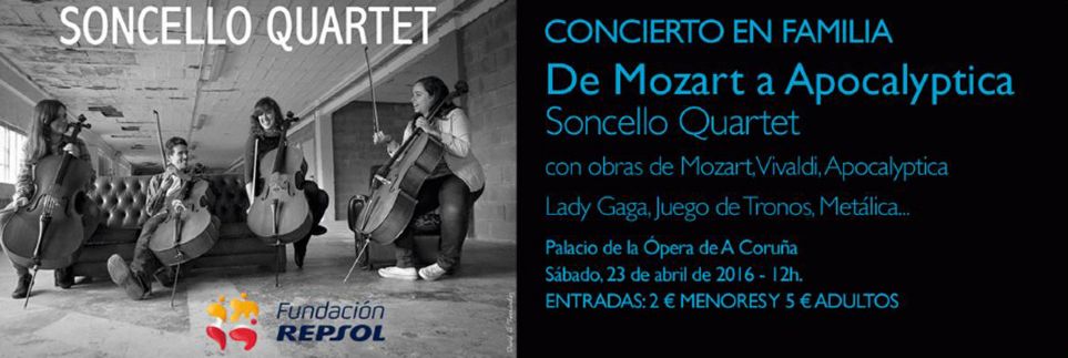 Soncello Quartet interpretará mañana su programa “De Mozart a Apocalyptica”, en el contexto de un concierto en familia que tendrá lugar en la Sala de Cámara del Palacio de la Ópera de La Coruña a las 12h. Los cuatro violonchelos que forman esta agrupación harán un repaso por las músicas de Mozart, Vivaldi, Metallica, Apocalyptica, Lady Gaga o la banda sonora de la serie televisiva Juego de Tronos, dentro del programa educativo y didáctico SonFuturo que organiza la Sinfónica de Galicia con el patrocinio de la Fundación Repsol.