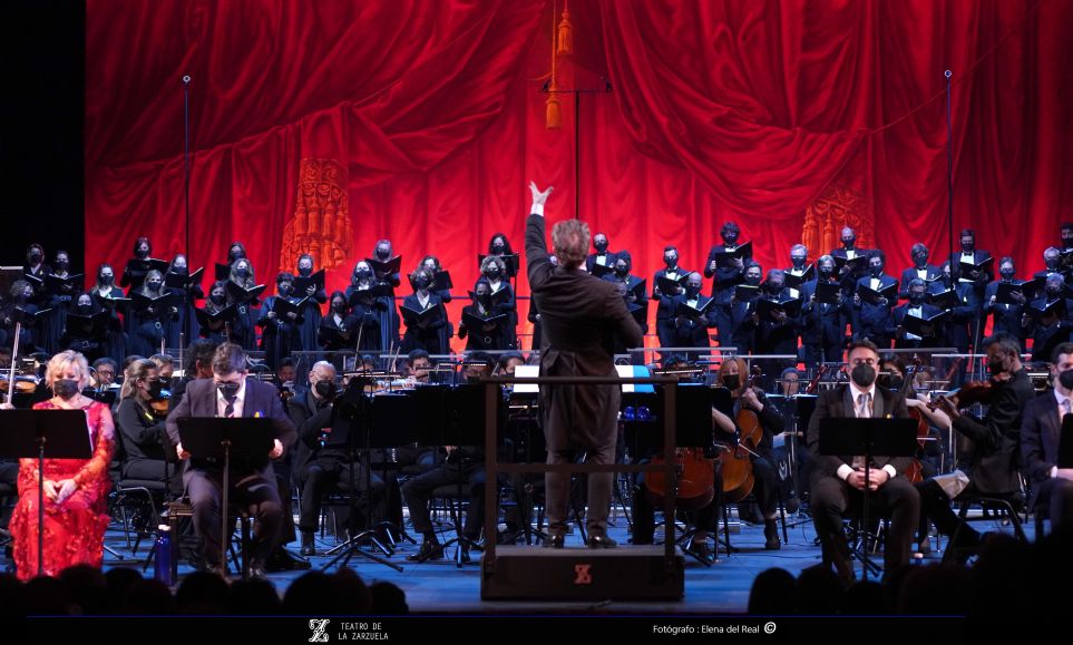 Incapaz de domeñar la orquesta y sacarle un sonido asumible, Ramón Tebar garantizó sentido narrativo y cierto orden, pero renunció también a un acompañamiento al canto más cuidadoso y colaborador, pretendiendo rivalizar, mediante una orquesta más bien áspera, con la ampulosa y crispada línea de canto. Dada la escritura para el coro, también exigentísima, esta vez tuvimos coro de verdad, unos 50 miembros y no los cuatro gatos habituales últimamente. De tal modo, que a pesar de la distancia y las mascarillas, pudo mostrar solvente presencia sonora - más que verdadero empaste- y sostener la complicada y angulosa escritura.