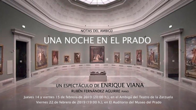 El Teatro de la Zarzuela no ha querido dejar pasar la ocasión de sumarse a la conmemoración de los 200 años del Museo del Prado. Lo hace con el recital-homenaje 'Una noche en el Prado’ del tenor, actor, dramaturgo y director Enrique Viana quien junto con el pianista Rubén Fernández Aguirre irá desgranando una historia que sucede en la Pinacoteca con «banda sonora» de romanzas de zarzuela y números musicales de revista relacionados con el arte pictórico. Serán en total tres funciones, dos enmarcadas en el ciclo Notas del Ambigú del coliseo el jueves 14 y el viernes 15 de febrero (20:00 h.), y una tercera en el Auditorio del propio Museo del Prado el viernes 22 de ese mismo mes (19:00 h.).
