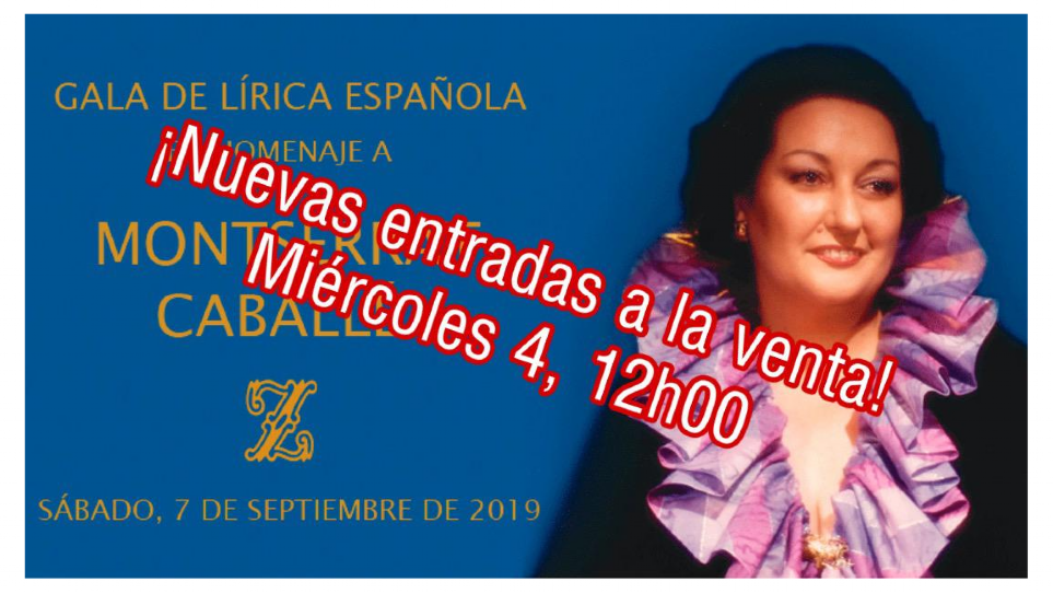 El Teatro de la Zarzuela pondrá a la venta mañana miércoles 4 de septiembre a partir de las 12:00 horas, nuevas entradas para la Gala de Lírica Española con la que el teatro quiere rendir homenaje a Montserrat Caballé. En el concierto, que se celebrará el sábado 7 de septiembre a las 20 horas, participarán José Bros, Isabel Rey, Ainhoa Arteta, Celso Albelo, Rubén Amoretti, Yolanda Auyanet, María Bayo, Gabriel Bermúdez, Maite Beaumont, Mariola Cantarero, Carlos Chausson, Nuria Espert, Andeka Gorrotxategi, Airam Hernández, Nancy Fabiola Herrera, Ismael Jordi, David Menéndez, Marina Monzó, Sabina Puértolas, José Luis Sola, Virginia Tola y Pilar Jurado. La venta se realizará simultáneamente a través de la taquilla del Teatro, de internet y del teléfono 902 224 949.