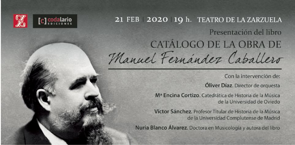 El Teatro de la Zarzuela acogerá el 21 de febrero [Ambigú, 19 horas] la presentación del Catálogo de la obra de Manuel Fernández Caballero, escrito por Nuria Blanco Álvarez y editado por Codalario Ediciones. Se trata del primer libro realizado sobre Manuel Fernández Caballero, el compositor más prolífico de la historia del género de la zarzuela y director musical en su día del propio Teatro de la Calle de Jovellanos. Intervendrán en la presentación el director de orquesta español Óliver Díaz; la Catedrática de Historia de la Música de la Universidad de Oviedo, María Encina Cortizo; Víctor Sánchez, profesor titular de Historia de la Música de la Universidad Complutense de Madrid; y Nuria Blanco Álvarez, doctora en Musicología, crítico de CODALARIO y autora del libro. La velada concluirá con una recital de canto y piano, protagonizado por la mezzosoprano Cristina del Barrio y la pianista Puerto González. En el programa, fragmentos de zarzuela y canciones de Manuel Fernández Caballero, algunos de los cuales se podrán oír por primera vez en el siglo XXI. La entrada es libre hasta completar el aforo.