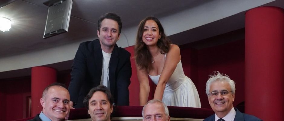 La soprano Nadine Sierra, el tenor Xabier Anduaga, Joan Matabosch (director artístico del TR), Henrik Nánási (director musical de La traviata), Willy Decker (director de escena) e Ignacio García-Belenguer (director general del Real)