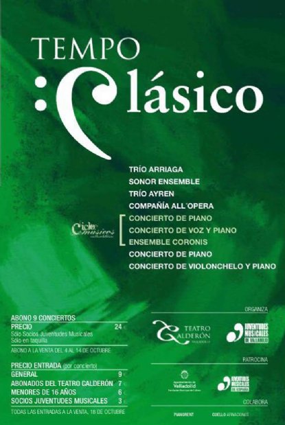 Un año más en la Sala Delibes del Teatro Calderón de Valladolid se pondrá en marcha el Ciclo Tempo Clásico, uno de cuyos fines es promocionar a intérpretes jóvenes, muchos de ellos con carreras ya contrastadas. “Creo que es una temporada excepcional que se puede dividir en tres bloques, uno destinado a los ganadores de distintas ediciones del Concurso Permanente de Juventudes Musicales de España, otro en el que tendremos la suerte de contar con músicos muy destacados, y un tercero con instrumentistas vallisoletanos, a los que hay que sumar la participación la Compañía portuguesa All´Opera”, explica Mabel Núñez, presidenta de Juventudes Musicales de Valladolid y organizadora del ciclo.