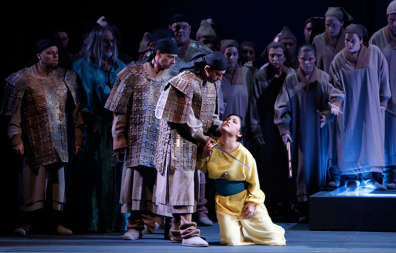 Susana Gómez eligió el camino de lo abstracto para contar la historia, e incluso mostró algún detalle en el que se notó la influencia de Emilio Sagi. La propuesta fue de circunstancias. La directora de escena dispuso de elementos muy modestos y dispares para elaborar una ópera de gran espectáculo. Era muy difícil conseguir grandes resultados con tan poco. La modestia del montaje nunca pudo desembarazarse de una cierta sensación de heterogeneidad, que se podría haber atenuado si, por ejemplo, no se hubiera optado por usar tantos colores y tipos diferentes de vestuario. Quizás inspirada en los Guerreros de Xian, Gómez obligó al coro a permanecer excesivamente inmóvil, en momentos en los que la música llamaba a otra cosa. A ello le unió una estética al estilo de los monjes budistas, puede que para recordar el conflicto del Tibet con China, y un contexto escénico abstracto en el que situó, justo en medio, una hermosa escalera de caracol. Este fue el aspecto más llamativo y menos interesante de la propuesta, que también dejó algún momento atractivo gracias al estimulante uso de la luz. La inclusión de la escalera resultó muy arriesgada. Si la intención era usarla únicamente por sus cualidades estéticas, sólo se contribuyó a potenciar la idea de mezcolanza extraña y un tanto forzada.