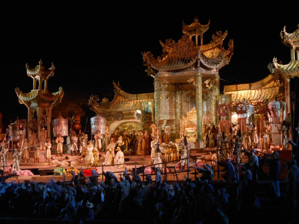 El concepto de ópera como espectáculo hunde sus legítimas raíces en la Grand Opera francesa decimonónica y constituye una tradición que ha retomado y encarnado perfectamente desde 1913 el Festival veraniego de la Arena de Verona. Un gran escenario, único por amplitud y belleza, además de la capacidad para captar y albergar miles de espectadores, un número mucho mayor que un teatro habitual de ópera. Turandot, la ópera póstuma e inacabada de Puccini es la cuarta mas representada en las 101 ediciones de los Festivales Arenianos con 128 funciones en 17 temporadas.