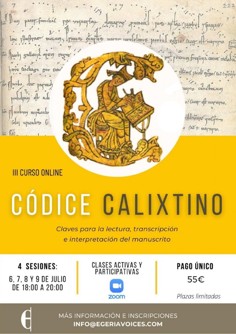 Tras el notable éxito de sus dos ediciones anteriores, el conjunto vocal femenino Egeria, que codirigen sus fundadoras, Lucía Martín-Maestro y Fabiana Sans, ha presentado la tercera edición de su curso en línea, que en esta ocasión estará protagonizado por un monográfico sobre el célebre Codex Calixtinus. El curso se dearrollará de forma digital y tendrá lugar, a lo largo de cuatro sesiones de dos horas, los días 6, 7, 8 y 9 de julio. Se trata de un curso dirigido a todo aquel músico, musicólogo o aficionado con buen nivel que tenga interés por el repertorio medieval. El objetivo principal de este curso monográfico es dotar al alumno de la autonomía suficiente para acometer la interpretación de este repertorio, leyendo directamente desde el manuscrito, con una metodología teóricopráctica, con la voz como instrumento principal. Para ello se trabajará sobre los cuatro ejes principales: paleografía musical y literaria, aspectos codicológicos y estructura del manuscrito, elementos de la liturgia y paraliturgia, además de análisis y claves para su interpretación.