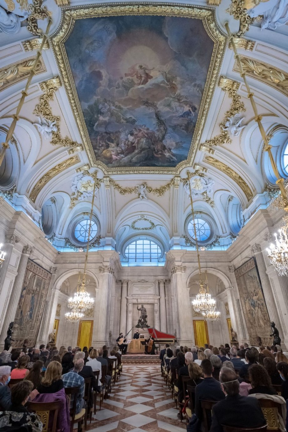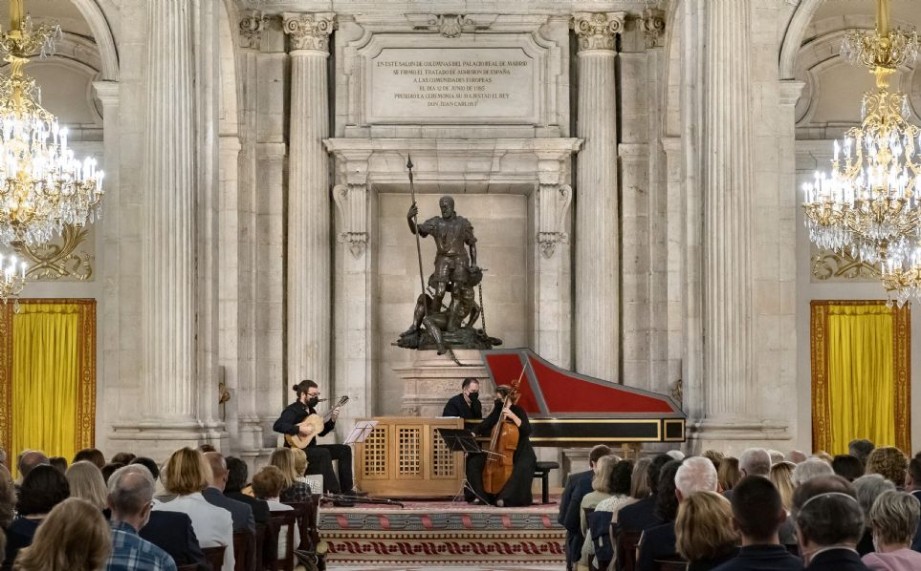 Madrid, 6-X-2021, Salón de Columnas de Palacio Real de Madrid. Temporada de conciertos 2021 de Patrimonio Nacional [XXXVII Ciclo de Música de Cámara]. Un concierto para María Bárbara. Repertorio napolitano para violonchelo solo en la primera mitad del siglo XVIII. Obras de Alessandro Scarlatti, Franceso Supriani, Giacomo Facco, Giovanni Bononcini, Domenico Scarlatti, Salvatore Lanzetti, Nicola Porpora, Santiago de Murcia, Domenico Porretti y Giovanni Battista Pergolesi. Ensemble Bonne Corde: Diana Vinagre [violonchelo (Stradivarius 1700) y dirección artística], Josep Maria Martí Durán [tiorba y guitarra barroca], Fernando Miguel Jalôto [clave y órgano positivo].
