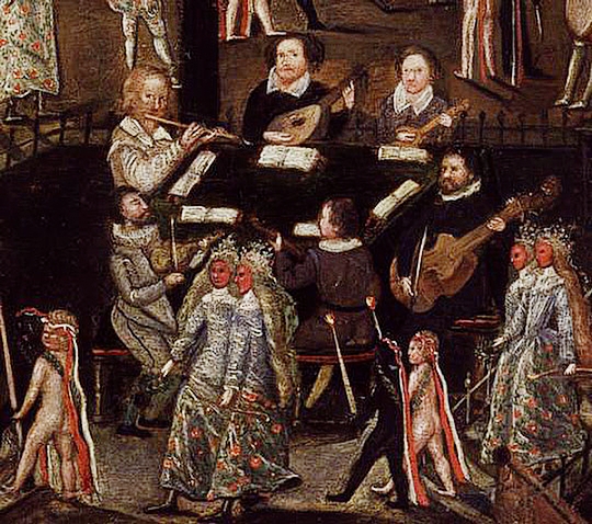 Detalle del Retrato de Sir Henry Unton [anónimo, c. 1596; The National Portrait Gallery], en el que se observa un claro ejemplo de broken consort en las islas británicas.